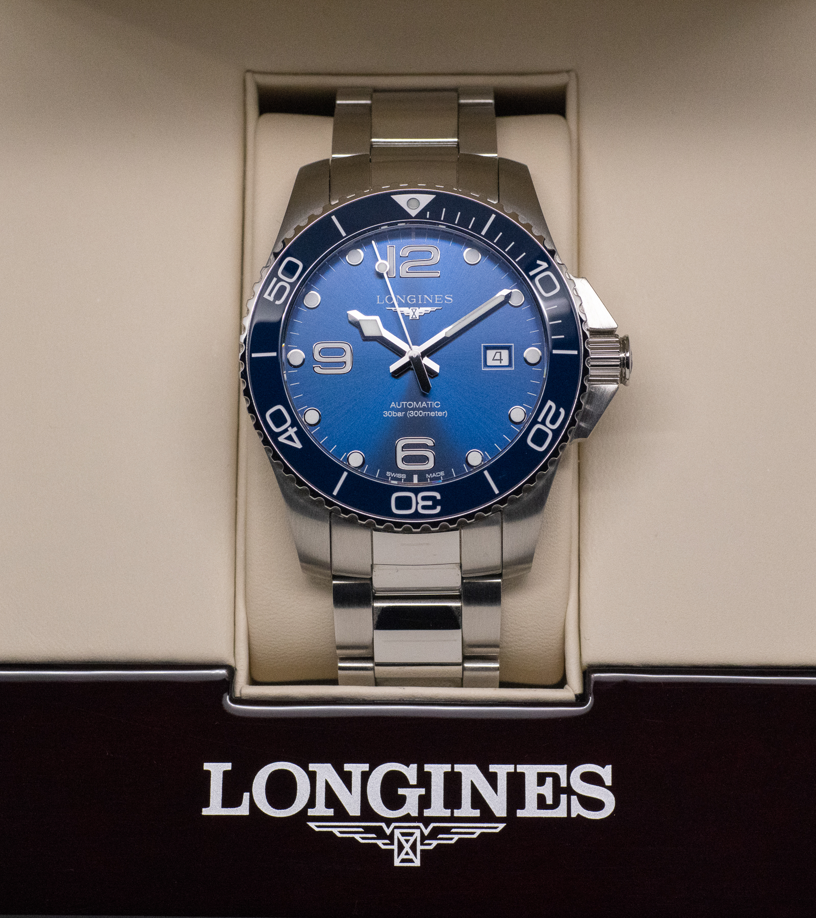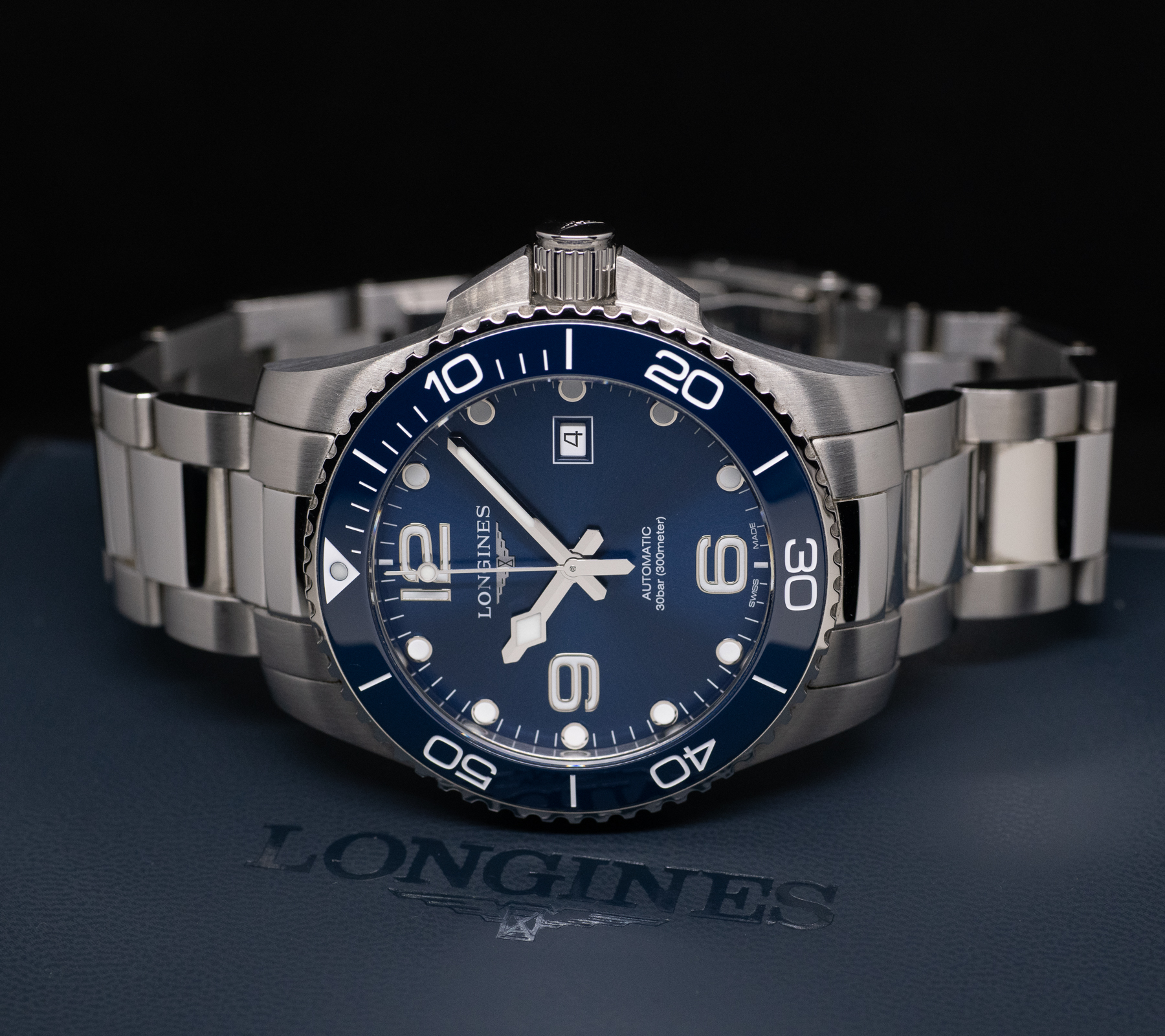 Reloj Longinest Hydroconquest, 43mm Ref: L37824966. Esfera azul, cristal de zafiro, bisel cerámico y movimiento automático. Funciones: Hora, Fecha, GMT.