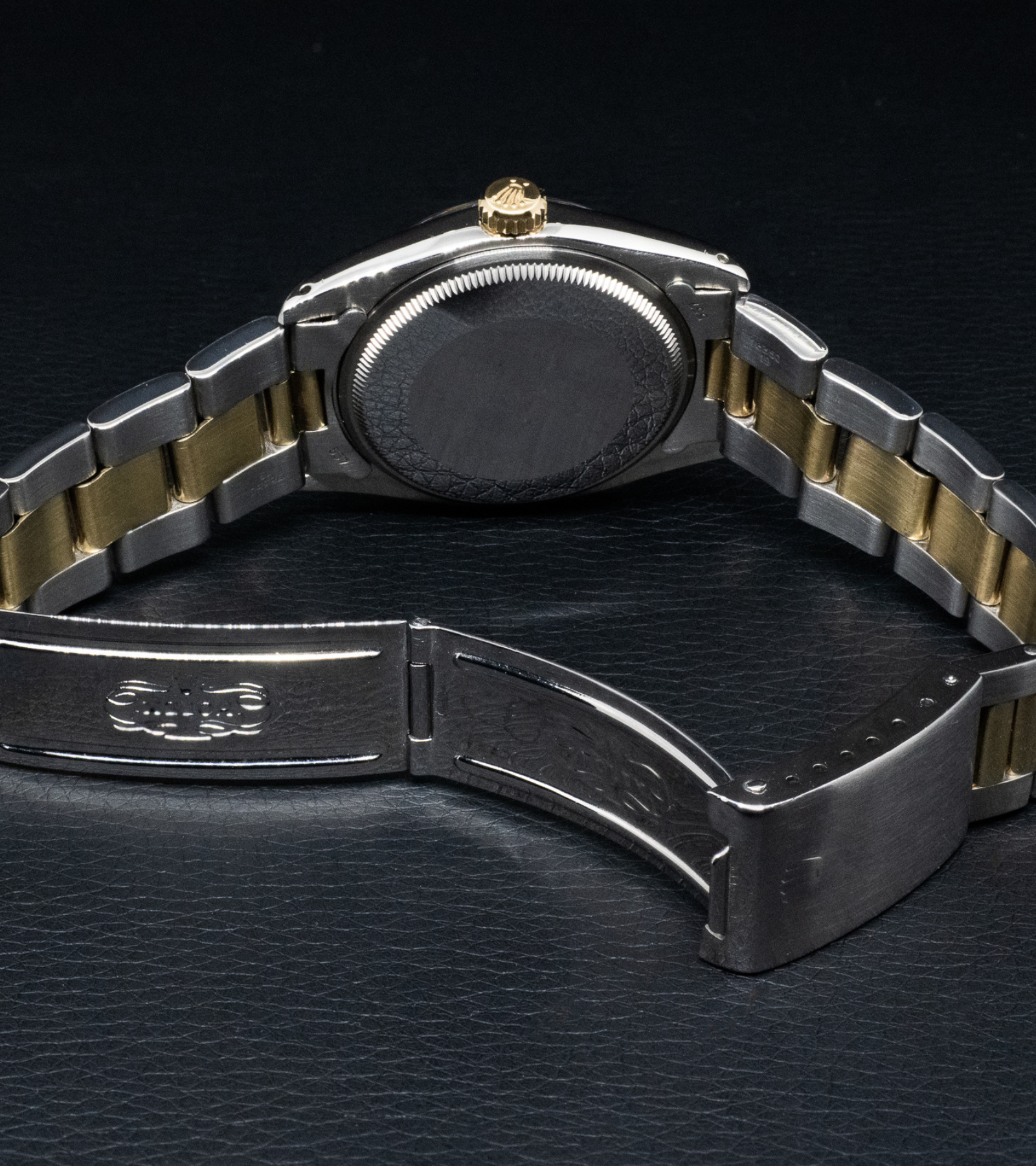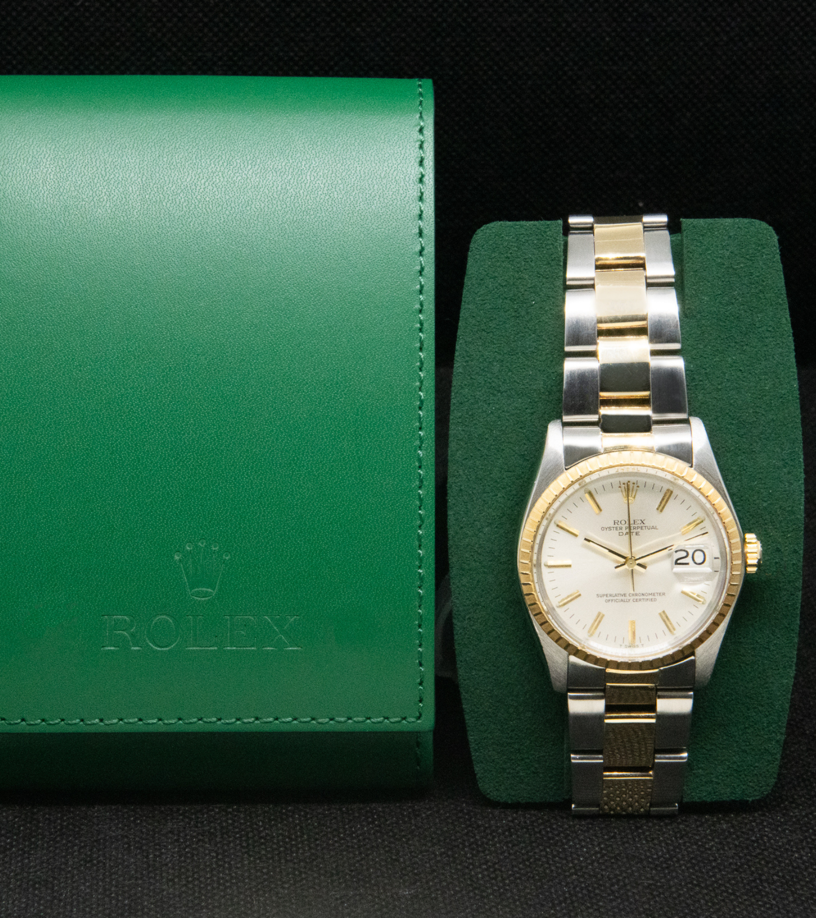 Rolex Date, con brazalete de Acero y oro, esfera plata y cristal de plexiglas. 34 mm, bisel de oro y movimiento automático. Garantía Rolex hasta 06-2026