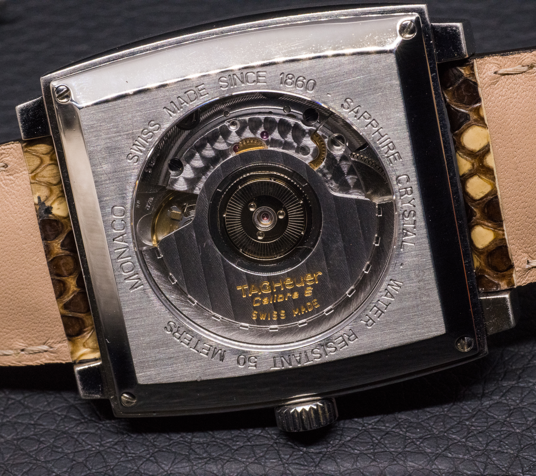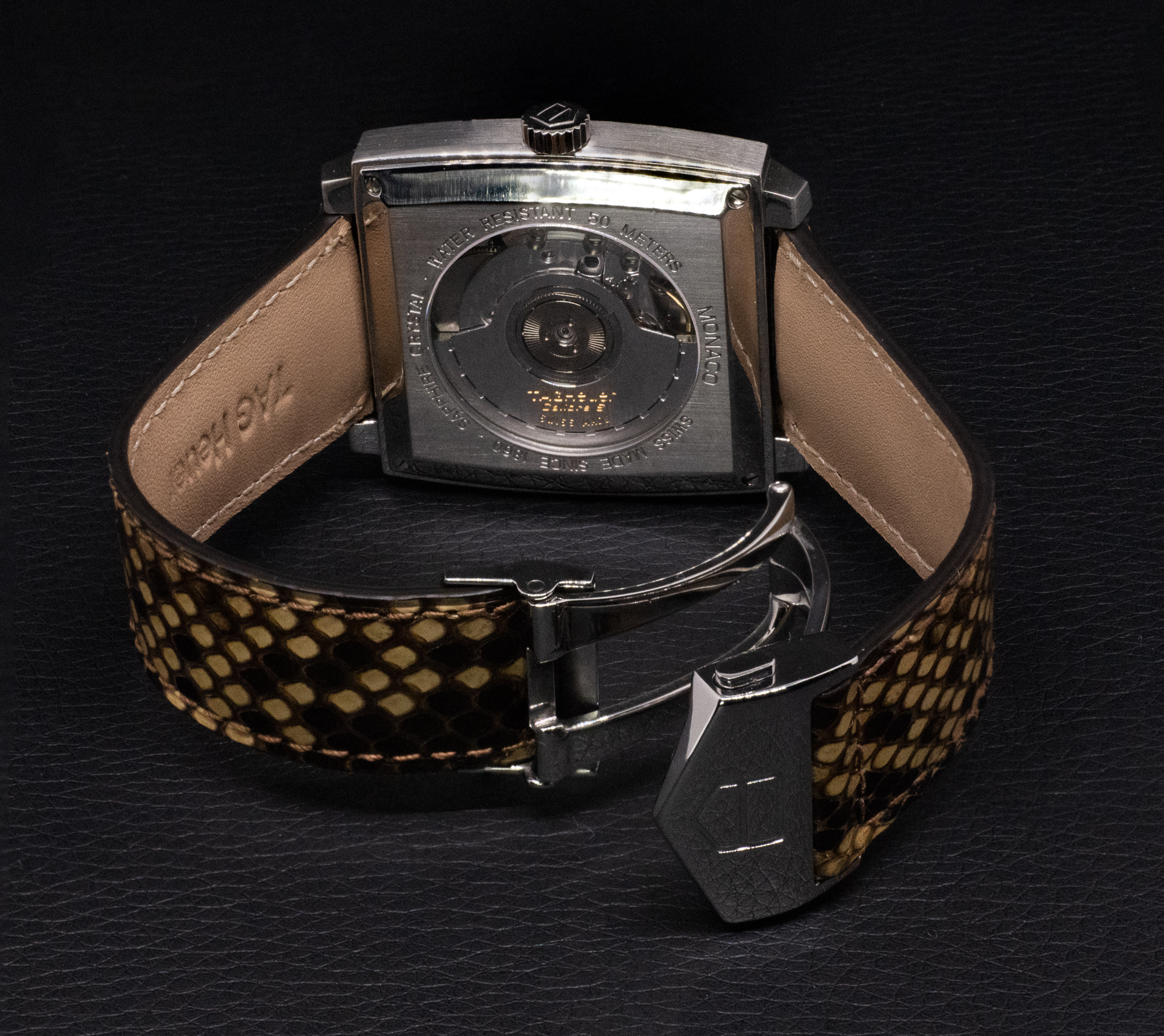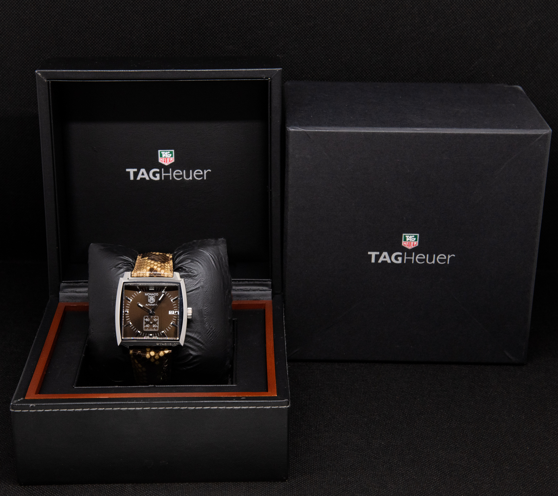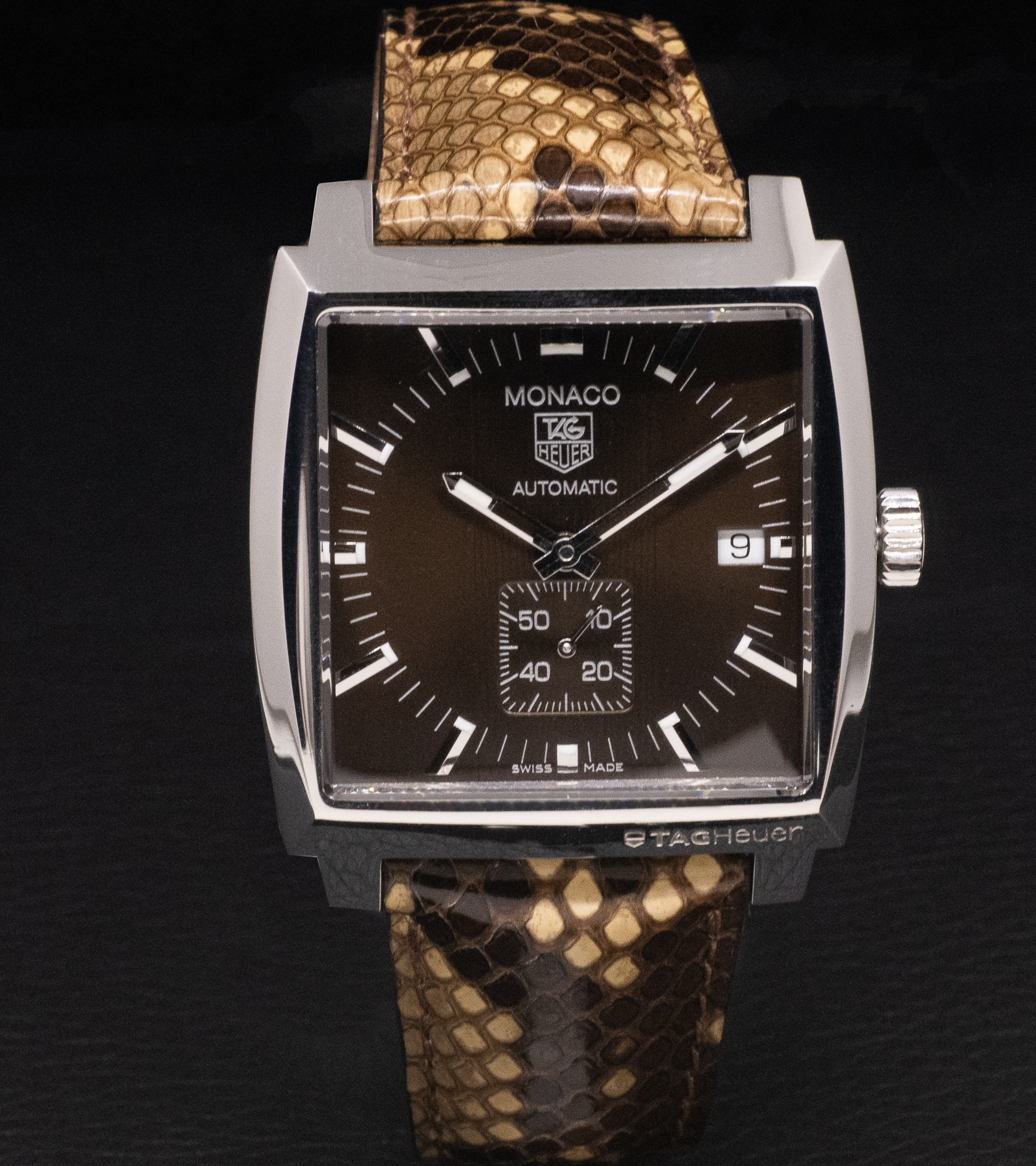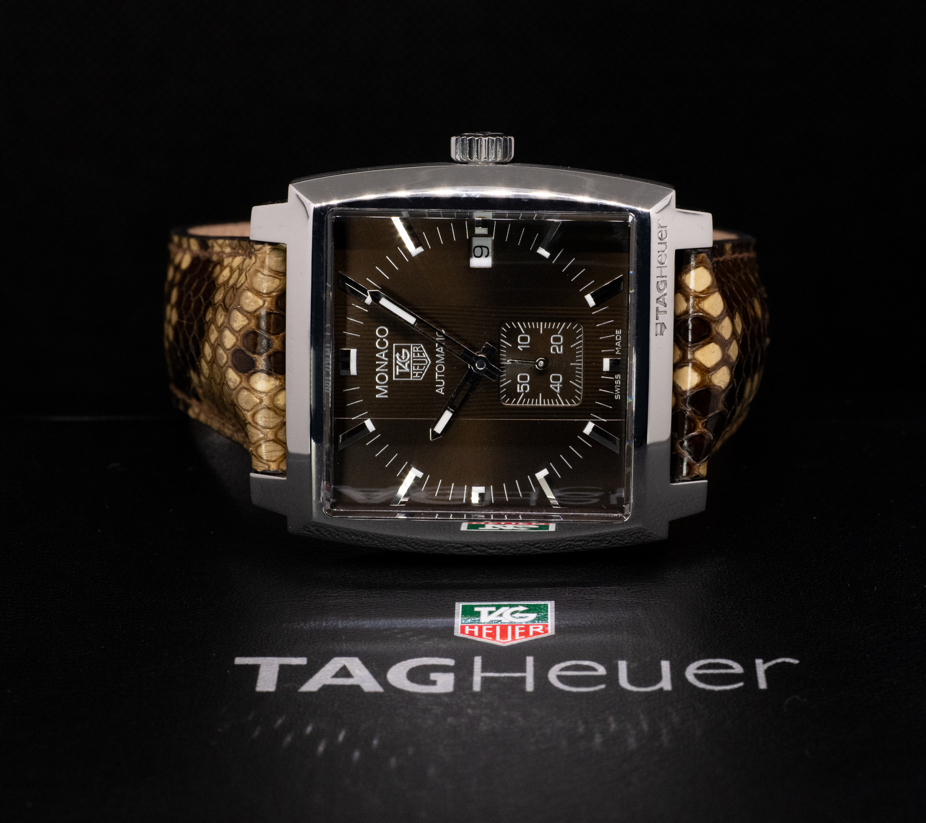 TAG Heuer MÓNACO, con brazalete de Piel Serpiente Phyton (Nueva a estrenar), esfera marrón y cristal de zafiro, 37 mm, bisel de acero y movimiento automático. Garantía de 2 años.